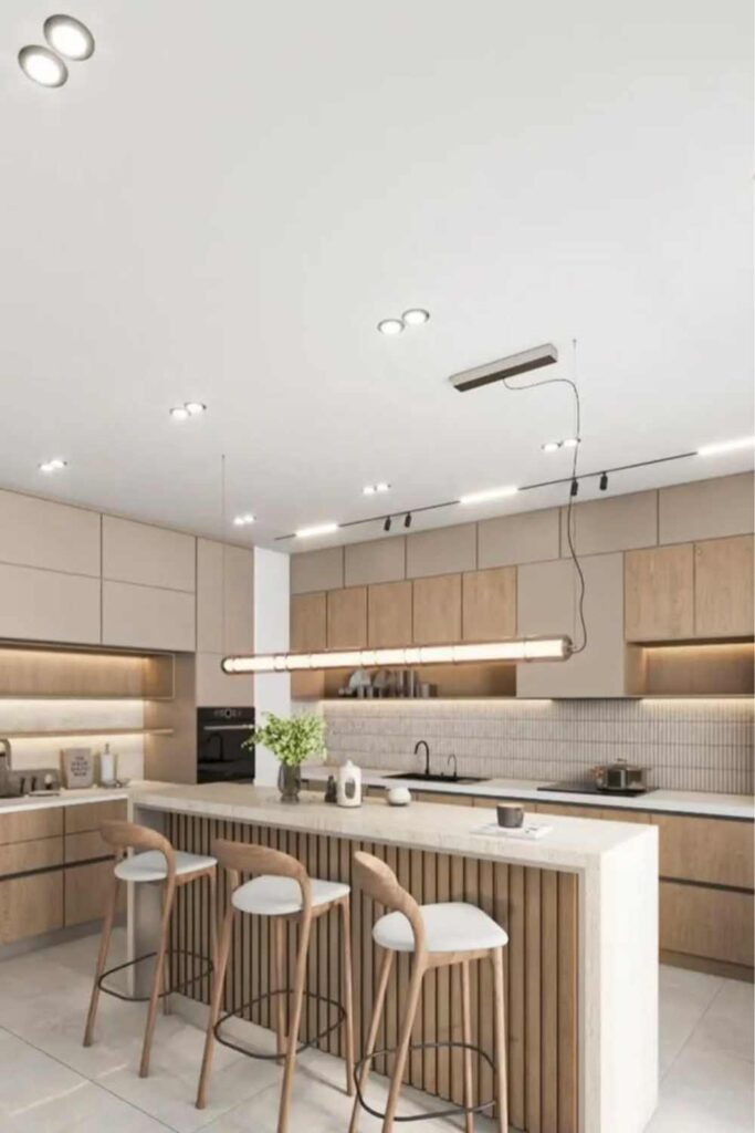 • Accent: Stylish pendant lights over an island or sink add a focal point and personality. Warm white bulbs (around 2700K-3000K) enhance the cozy feel of beige. FYI, this makes a huge impact!